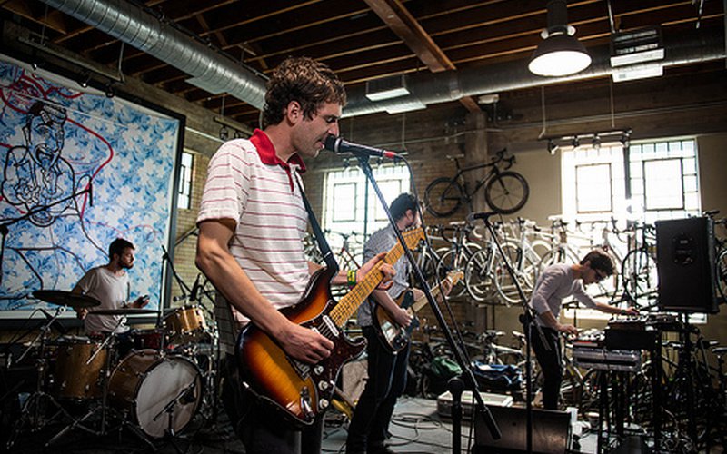 Montreal's Suuns make a particular kind of low-drone heavy but never "drone music" - they walk the fine line between being experimental and being simply loud rock music. There's never really been the kind of rock n roll vibes you get from other bands walking that line, but instead an industrial synth entrance to many of their songs, especially on their latest album Images Du Futur, which was released this March. It's clear their past tours have lent them a deeper understanding of their own music making, as they were calm and happy when they took stage at Mellow Johnny's Bike Shop in Austin during our SXSW broadcast, despite their musics melancholic and emotive sound.