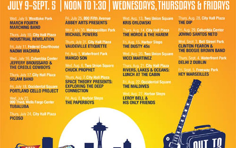 This year's lineup boasts over 25 acts, but KEXP is especially excited to sponsor sets from Bay Area rocker Chuck Prophet, three-time Latin Grammy nominee Jovino Santos Neto, Jamaican reggae artist Clinton Fearon & the Boogie Brown Band, and beloved local artists Hey Marseilles, The Maldives, The Dusty 45s, The Horde & the Harem, and Kris Orlowski. Check out the complete line-up here, along with a list of locations from Belltown to Pioneer Square. Bring your sack lunch!
