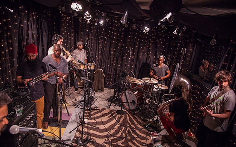 Brooklyn’s brassy big band Red Baraat stopped by on their way across the country on a national tour to bring their infectious world music into the KEXP live room. Led by percussionist Sunny Jain, the eight members draw on a Bhangra blend of North Indian rhythms mixed with hip-hop, funk and New Orleans jazz to create undeniably unique party music. Featuring a selection of cuts from the grandiose new release, Gaadi of Truth , their recent in-stuido performance at KEXP is full of irresistible grooves with tracks like "Zindabad" or the closing "Tunak Tunak Tan", lending an air of spontaneity and plain old good times. Watch the full set to see a band whose live energy is hard to match and nearly impossible to resist.