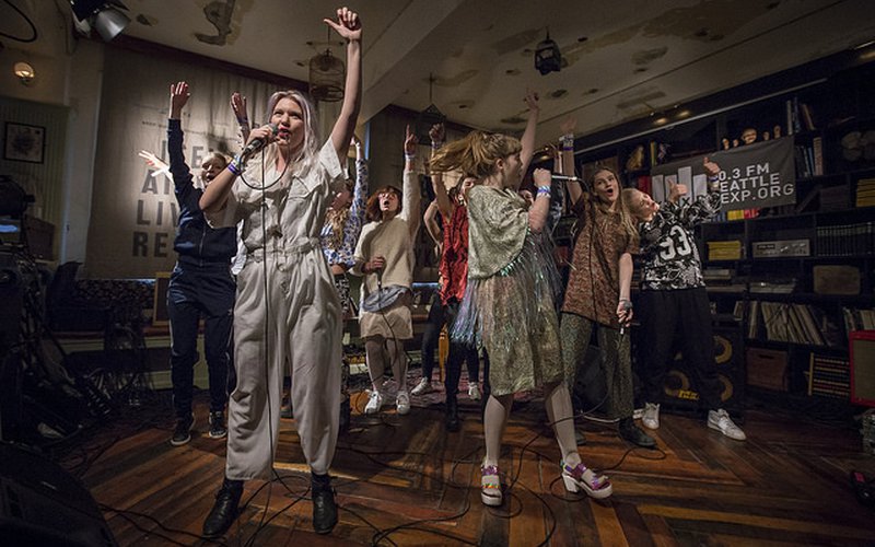 Icelandic hip hop collective Reykjavíkurdætur ("Daughters of Reykjavik") are a force to be reckoned with. A huge group of seventeen women, they work together to create songs about topics ranging from sexual politics to political ones. During KEXP's broadcast at Iceland Airwaves last year, they played to a packed house at Kex Hostel in Reykjavik. Before their show, they sat down to discuss their music, sisterhood, being female rappers in Iceland, and the country's political climate. I spoke with their manager, Alda Karen Hjaltalín, as well as three members of the collective: Vigdís Ósk Howser Harðardóttir, Anna Tara Andrésdóttir, and Steiney Skúladóttir.