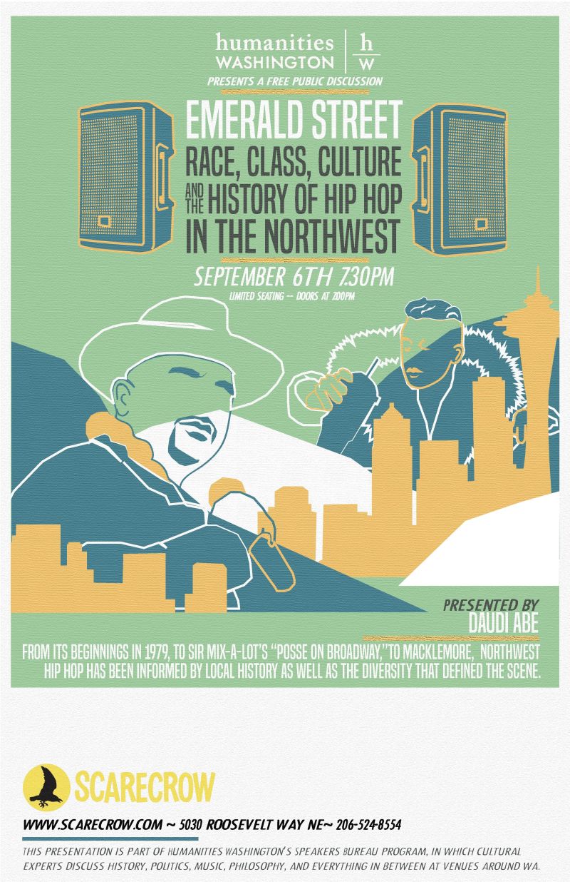 On Thursday September 6th, professor and author Daudi Abe will lead a discussion on the impact hip-hop culture has had on the Pacific Northwest in Scarecrow's Screening Room. Through the prism of our region's singular hip-hop community, the multimedia lecture will illuminate the many ways it has impacted politics, our region's social climate, and pretty much every facet of its cultural makeup.