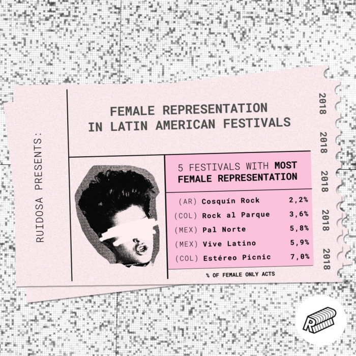Desde Chile, la reconocida artista Francisca Valenzuela, creaba un colectivo motivada por su necesidad de cambiar las reglas del juego en la industria musical de América Latina. En la actualidad, RUIDOSA, se convirtió en el único medio periodístico y musical latinoamericano que estudió entre 2016 y 2018 las cifras de representación femenina de 66 festivales musicales de esa región. Desde las desalentadoras cifras se crearon líneas de acción tendientes a multiplicar la escena musical.