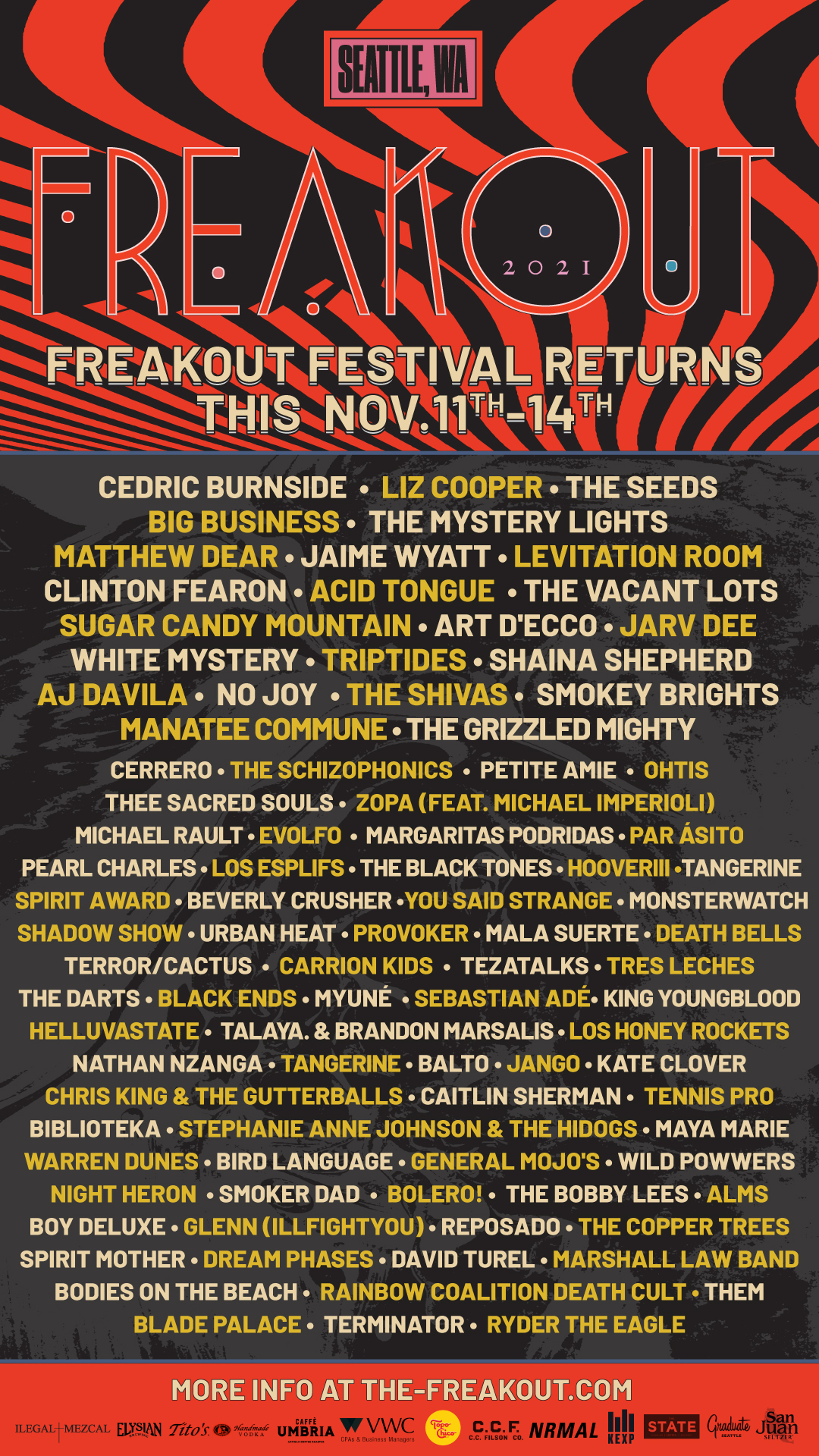 It’s almost November already! Time flies when you’re fretting about the world and witnessing the collapse of society in real time! Freakout Festival has turned the festival dead-zone of wet and grey mid-autumn into a destination spot, returning for its 2021 installment November 11th-14th in its home of Ballard. Its cup runneth over with great live music, from local mainstays like Jarv Dee, Beverly Crusher, and Shaina Shepherd to internationally known rippers like the Seeds(!!), AJ Dávila, Cedric Burnside, and Los Esplifs. A few of the acts are playing twice over the festival’s five days, so hopefully you won’t have to navigate conflicts — Burnside, the Black Tones, or Acid Tongue on Friday? The Shivas, Tres Leches, or Beverly Crusher on Sunday? You still have over a month to map out your festival experience, so check out the schedule here and scroll past it to buy tickets if you haven’t already!